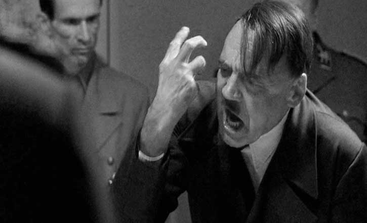 Vi diskuterar även bilderna av Hitler, som förmedlas via populärkultur och vetenskap. Var Hitler ”ett tomt kärl”, som fylldes av andras drömmar, tankar och förhoppningar? Var Hitler den psykotiske galning, som exempelvis syns i den hyllade tyska filmen ”Undergången: Hitler och Tredje rikets fall” (”Der Untergang”, 2004, bild nedan).