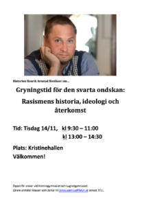 Tisdag 14 november håller jag dubbla föredrag i Falun, under rubriken ”Gryningstid för den svarta ondskan: Rasismens historia, ideologi och återkomst”. Det första kl 9:30 och det andra kl 13:00. Plats: Kristinehallen. I förstone är föreläsningarna för gymnasieelever, men såvitt jag förstått är även allmänheten välkommen (i mån av plats). Vi ses!