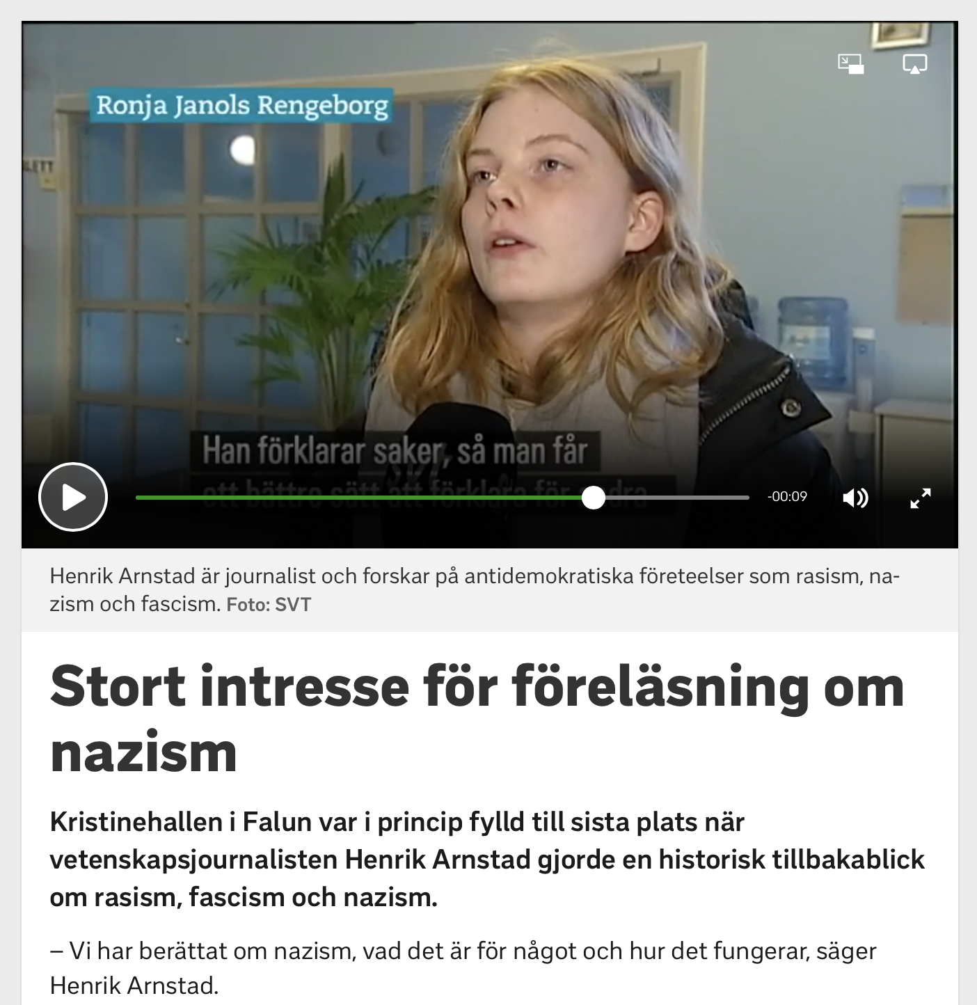 SVT var på plats i Falun när jag två gånger höll föreläsningen ”Gryningstid för den svarta ondskan” om rasismens teori, praktik och historia: