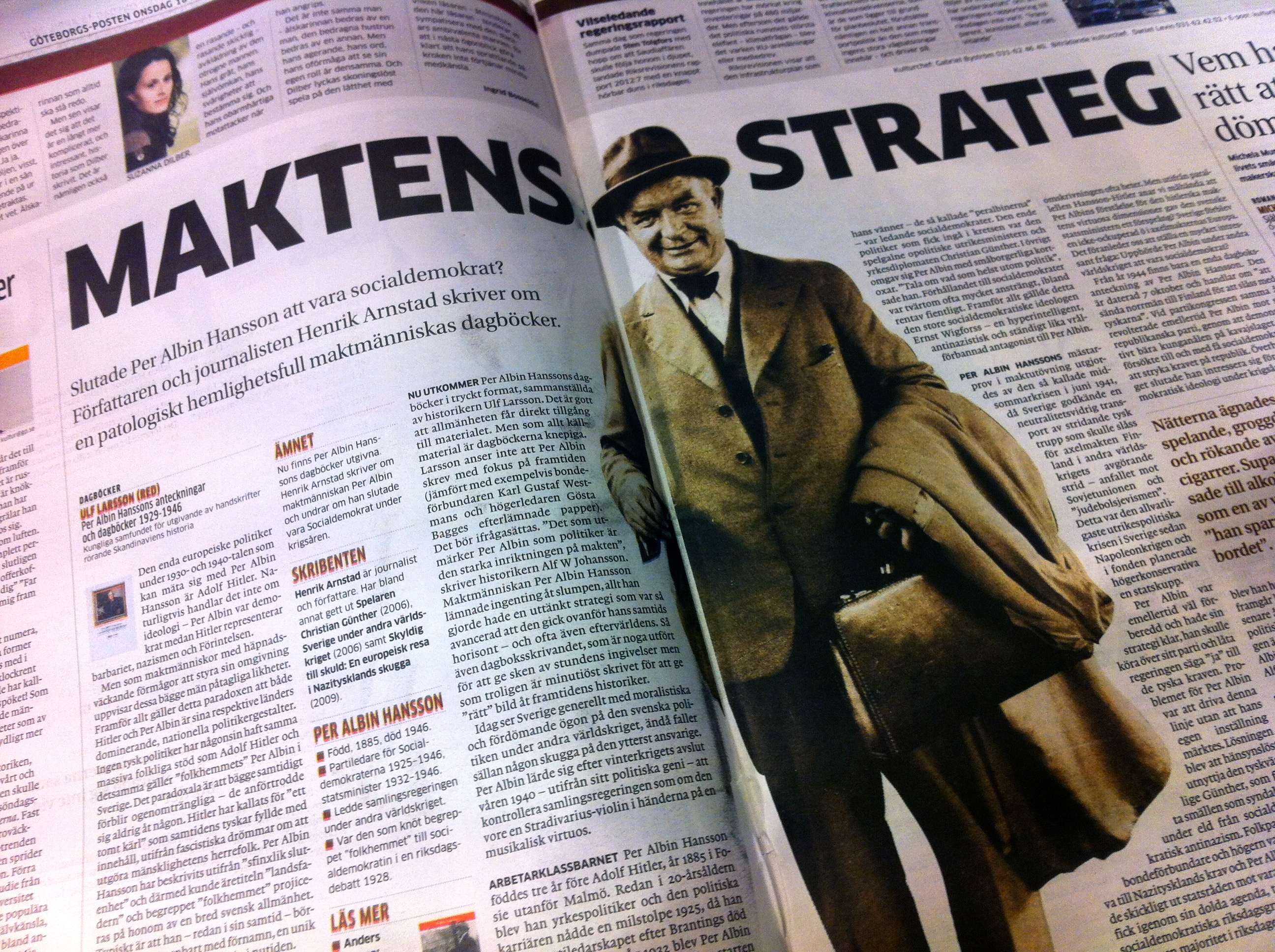 Göteborgs-Postens kulturbilaga publicerar idag en större artikel om ”landsfadern” Per Albin Hansson, legendarisk socialdemokratisk partiledare och statsminister. Författare till artikeln är Henrik Arnstad och den skrivs med anledning av att denne politikers dagböcker tryckts och givits ut för allmänheten. i Artikeln intar jag en kritisk syn på den allmänna, idoliserade synen på denne man, som är den ende politiker vilken benämns enbart med förnamn i svensk modern historia. ”Per Albin” var ett varumärke som blev större än sitt parti: