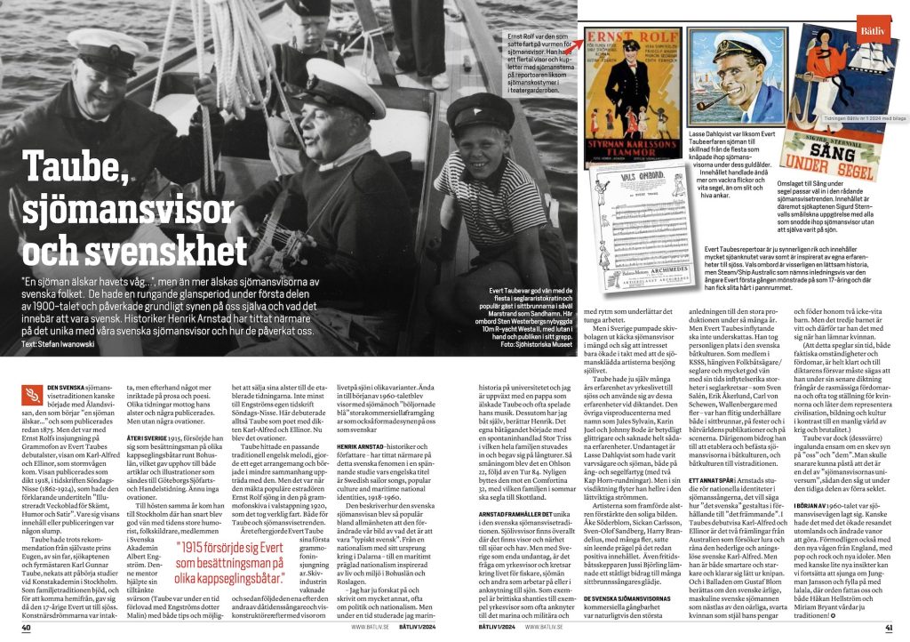 Alltför sent nämner jag här att tidningen båtliv skrivit om min forskning om populärkulturella sjömansvisor och svensk nationalism under rubriken ”Taube, sjömansvisor och svenskhet” (Båtliv 1/2024). Men bättre sent än aldrig!