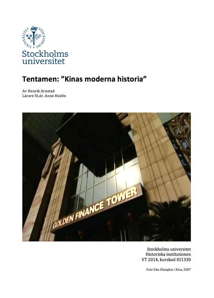 Jag har idag inlämnat tentamensuppsats på kursen ”Kinas moderna historia” (10hp) på Stockholms universitets historiska institution.