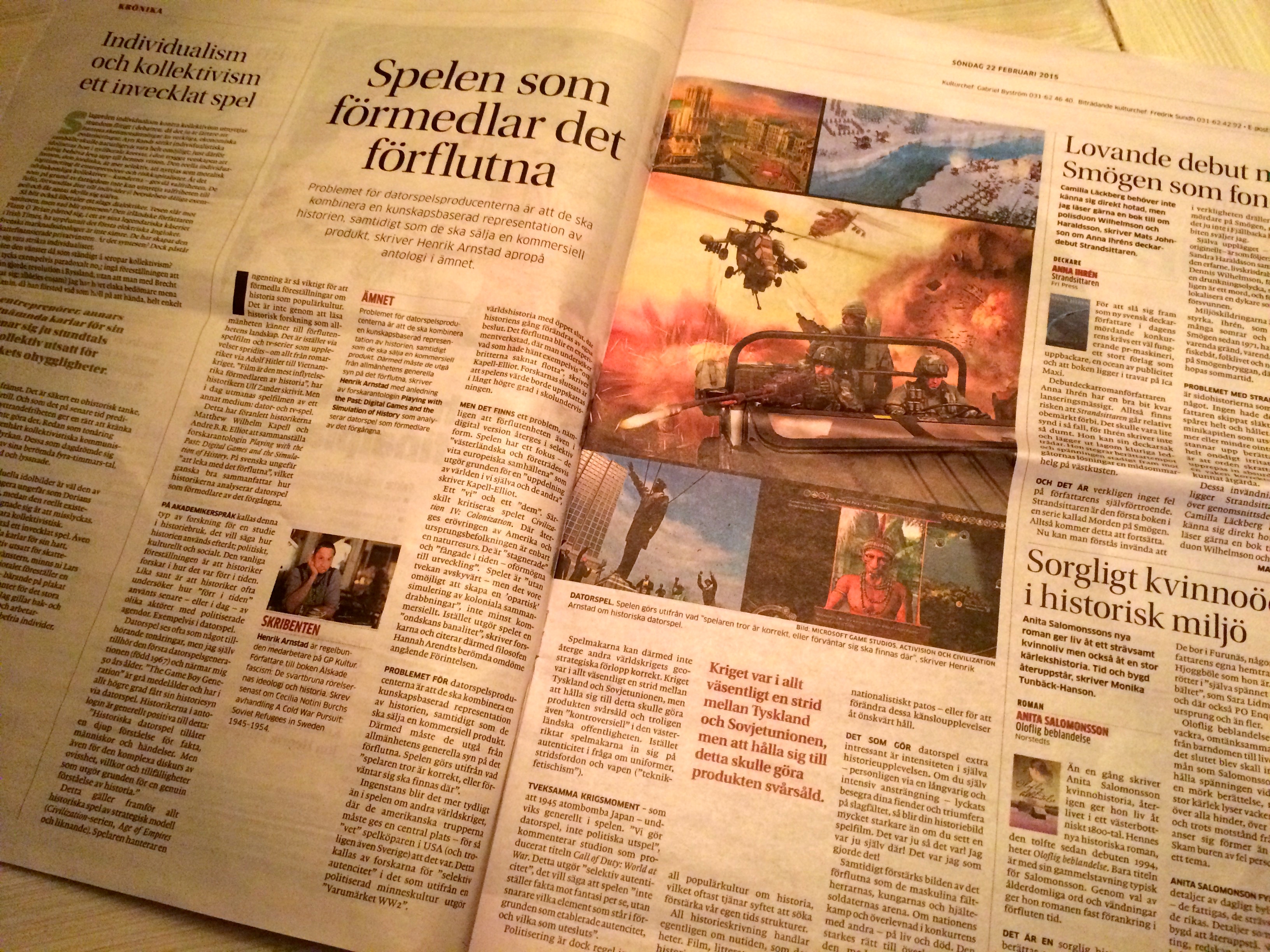 Henrik Arnstad recenserade 22 februari 2015 forskarantologin Playing with the Past: Digital Games and the Simulation of History (red. Matthew Wilhelm Kapell, Andrew B.R. Elliott) i Göteborgs-Postens kulturbilaga.